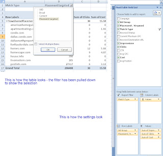 Yes, you can answer all of these by going back to the report console in Adwords and pulling separate Network level, ad group level and Campaign level reports for each, but a simple Pivot Table can help yo to get answers to all these questions right from the Keyword / Placement Report you downloaded initially. Let’s see how..