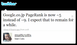 A recent Twit from Matt Cutts confirms that the PageRank of Google.co.jp has been reduced and it is likely to be so for some time now.