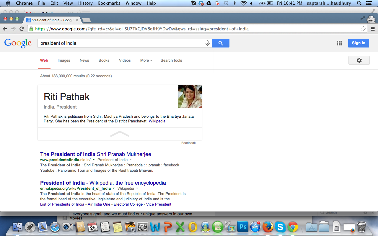 I couldn’t believe my eyes ! I saw this first on Facebook but thought it would be another of those Photoshopped pranks but then thought to check it out myself and whoa!! Google shows some unknown District Panchayat president, Riti Pathak’s name and details when you search for “President of India”. The entity search is completely screwed up..